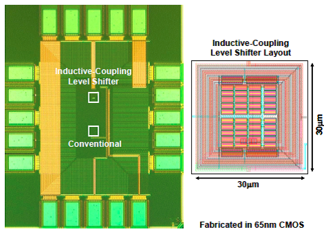 0.45Vから2.7Vに変換可能なレベルシフタを開発しました。コイルによる誘導結合を用いることで、広い動作範囲を確保しながら、従来に比べ、1/2のエネルギー効率、1/4の遅延時間を達成しました。