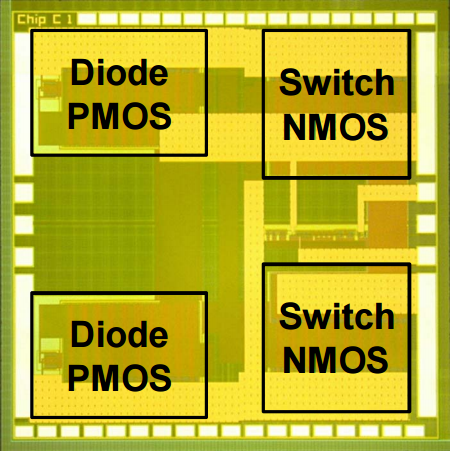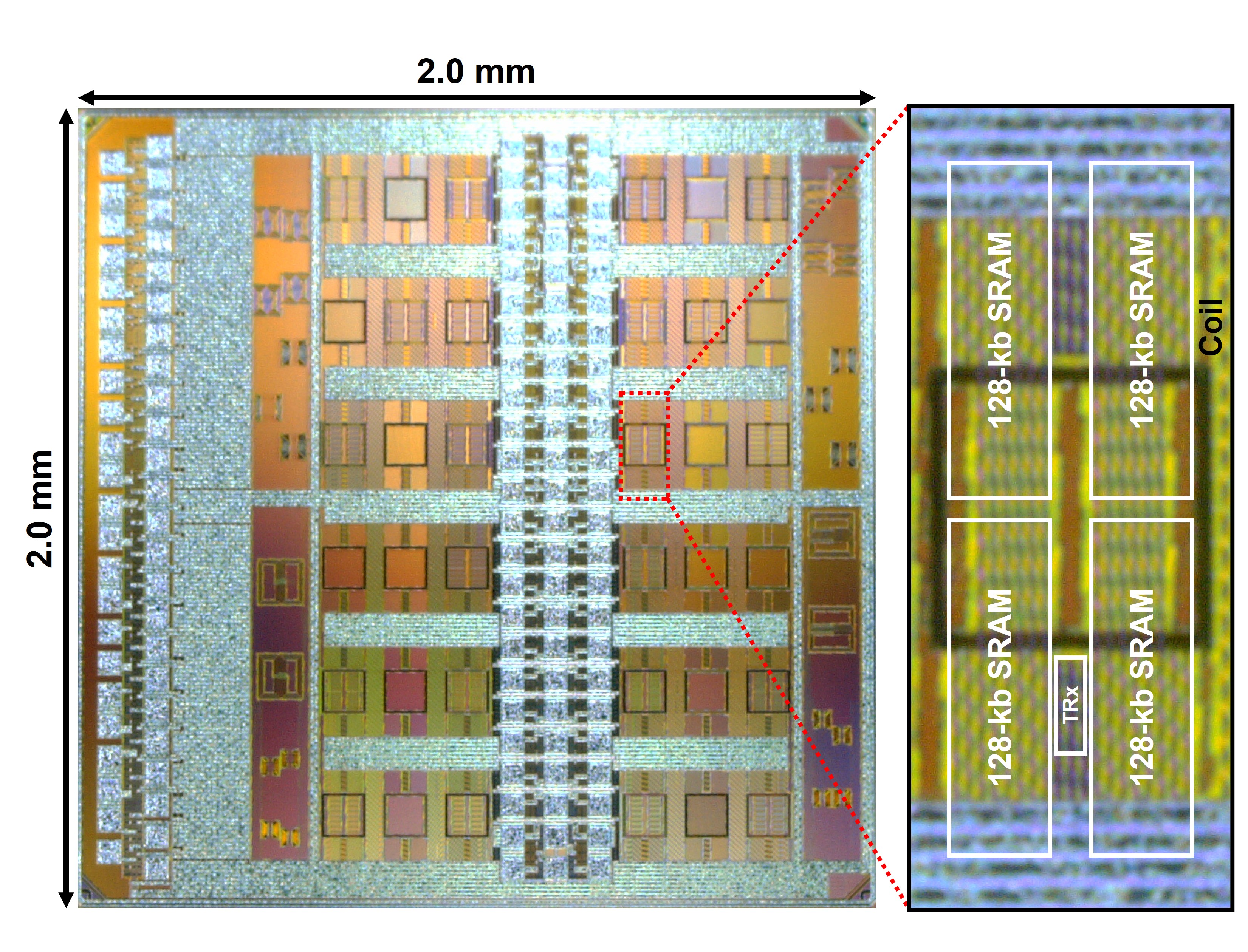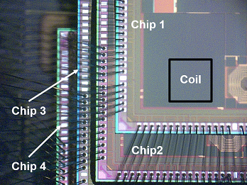誘導結合を用いた、3次元集積されたチップ間の無線給電システムを提案、実装しました。新規のトポロジーの整流器と、最適化されたオンチップインダクタを用いることで、従来に比べ、13倍の受信電力を達成しました。