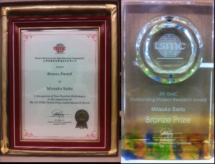 | 22 | 斉藤美都子:5th TSMC Outstanding Student Research Award Bronze Medal Prize, 5th TSMC Outstanding Student Research Award, 2011/10. | 画像 |