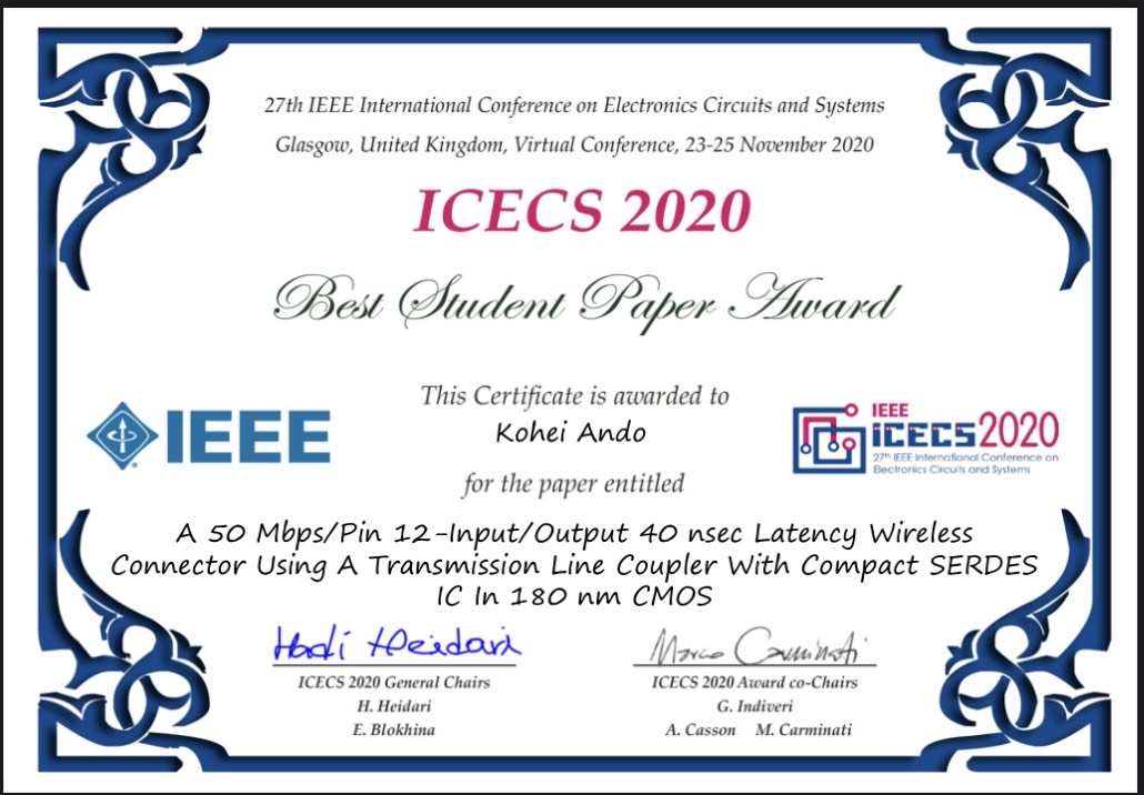 | 34 | K. Ando, K. Shiba, K. Akatsuka, C. Cheng, T. Arakawa, M. Hamada, T.Kuroda:IEEE ICECS 2020 Best Student Paper Award, 2020/11. | 賞状 |