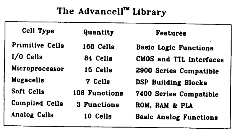 サブナノセコンドの負荷遅延を伴う1.5ミクロン2層メタルCMOS標準セルライブラリィが議論されています。ライブラリィには160以上のスタンダードセル、80のI/Oセルと17290のメガセルがあり、セコンドソースがあります。