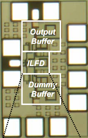 電源電圧1.2V、消費電力1.65mWの、60GHz帯注入同期型分周器(ILFD)を開発しました。複数次のLCフィルタを持つLC発振器を用いることで、48.5-62.9GHz(25.9%)の広いロックレンジを達成しました。