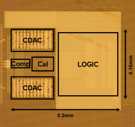 スプリットキャパシタDACの校正手法を提案しました。従来よりも大きなブリッジキャパシタを用いる事でミスマッチを埋めるチューニングを可能にしました。正確な校正のためにコンパレータのオフセットをキャンセルしています。