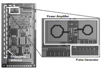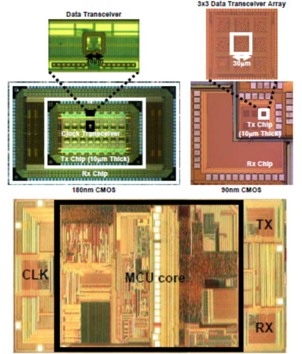 広帯域、低電力、低コストのパルス誘導結合インターフェースを用いて、SiP用チップ間通信において0.14pJ/bを達成し、また、LSIパッケージ内のチップモニタリング用の非接触インターフェースを開発しました。